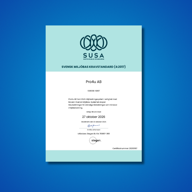 Pro4u är miljödiplomerade. En miljödiplomering innebär att verksamheten inför ett miljöledningssystem enligt kraven i Svensk Miljöbas. Miljöledningssystemet bidrar till att skapa ordning och reda i miljöarbetet och att minska verksamhetens miljöbelastning. Miljödiplomeringen innebär också att vi har fått hjälp att granska vår miljöpåverkan och värdera vårt fortsatta arbete.